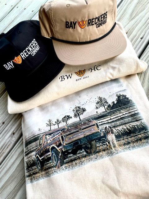 Baywrecker's "Vintage Truck" T-shirt in Sand Beige. In stock in sizes Large, XL, and XXL. Features BW/HC custom logo on front.